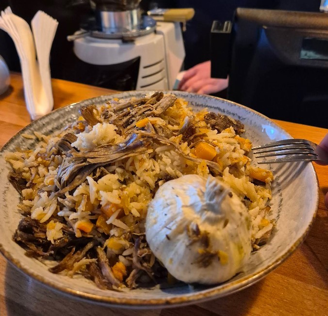 Bir's pilav on Teraziye serves two types of pilaf - with lamb and beef, shurpa, Korean carrots and traditional Uzbek salad achichuk. You can either eat in the establishment or take food with you.