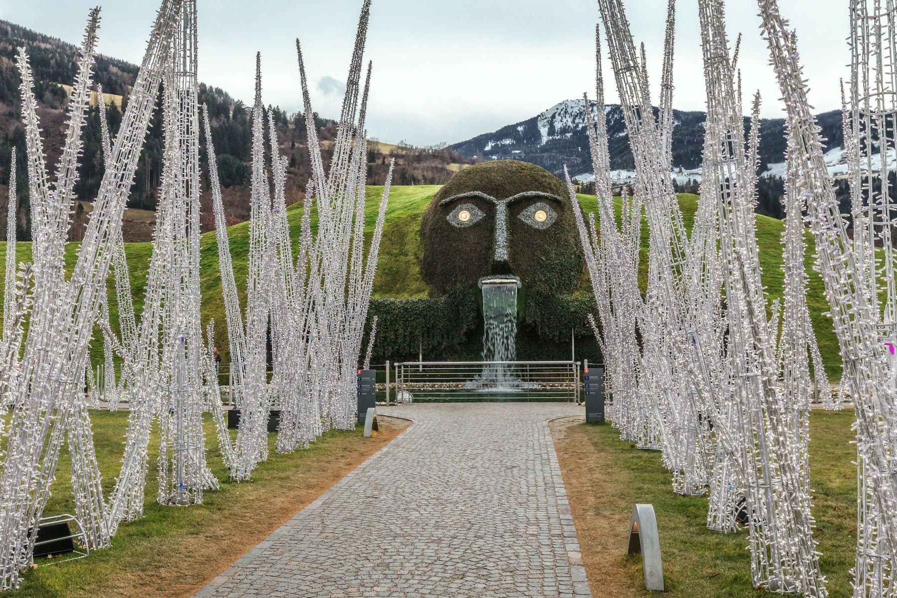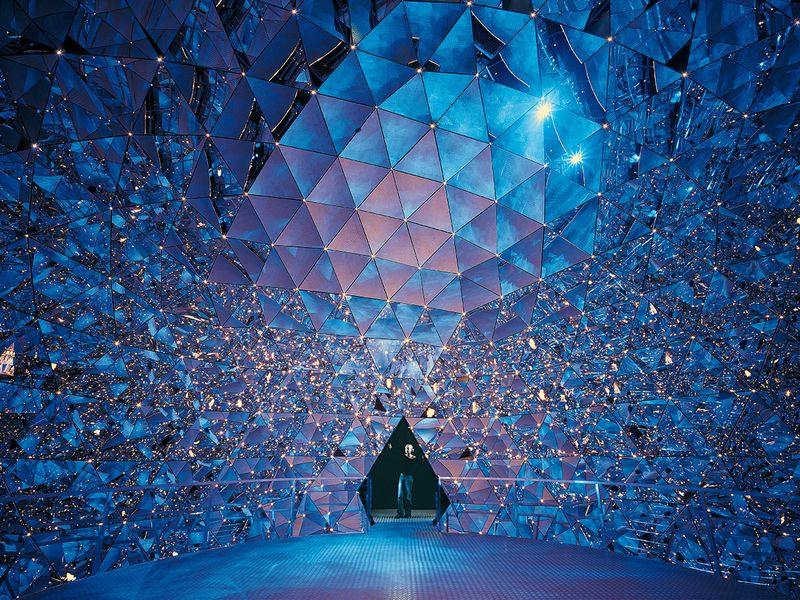 Swarovski Kristallwelten (Swarovski Crystal Worlds) in 1995 near Innsbruck in the town of Wattens opened the Swarovski Museum, in honor of the centenary of the Swarovski company. The museum is built in the form of a huge cave with 7 crystal halls filled with crystals, which are guarded by a Tyrolean giant, who has lived in Tyrol since time immemorial. A waterfall flows from his mouth, small splashes of water shimmer in the sun with all the colors of the rainbow and resemble the reflections of crystals.