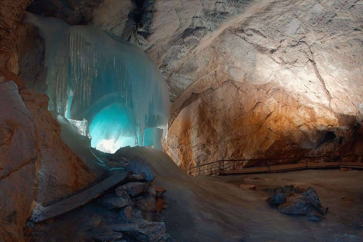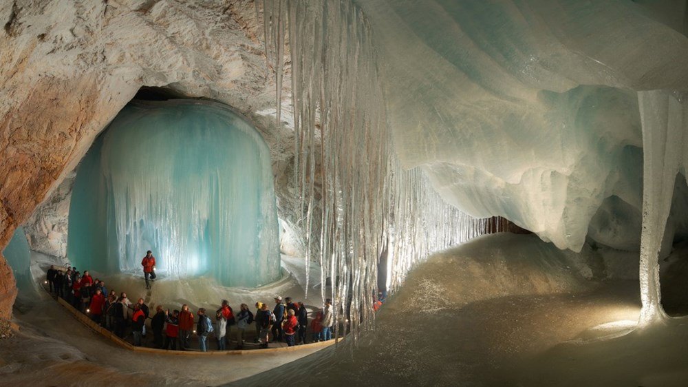 The cave is located at an altitude of 1641 m in the Alps. The cave consists of many mysterious passages that the river naturally created here. The limestone rocks were washed away by water over several millennia. The ice build-up on the walls and vaults was formed by the natural melting of the Alpine snow.