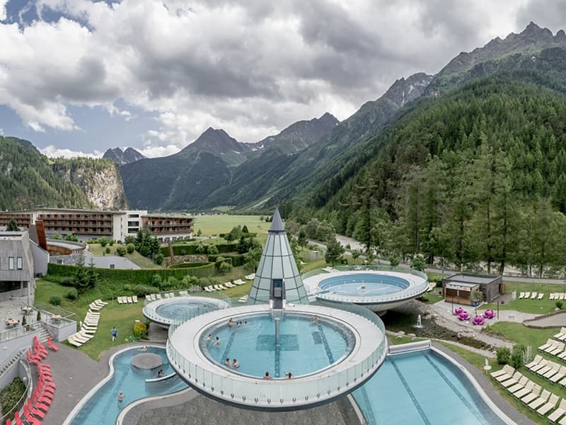 The Aquadom thermal baths are among the best in Austria. In the heart of the Otztal valley in Tyrol, near one of the most popular ski resorts, Solden. In the village of Langefeld, on the site of a hot spring with thermal water, a huge thermal complex was built. It is especially pleasant to relax in it on a frosty evening after skiing.