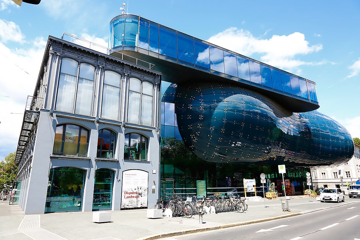 Gallery of modern art. It is located in a building of an unusual shape, which is why it received a second unusual name - "friendly alien". The convex building of the gallery is built in the style of modern architecture "blob". It looks like reinforced concrete, but is made of blue plastic panels.
