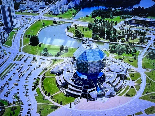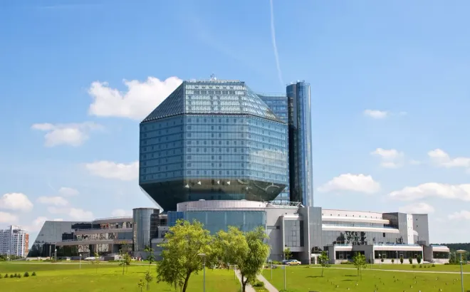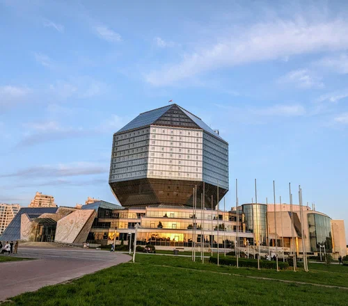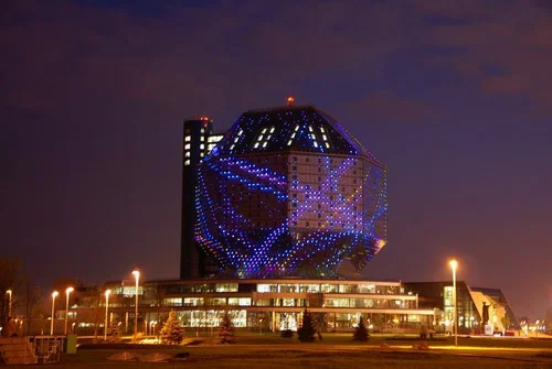 Библиотека размещается в одном из самых необычных зданий в Беларуси — его построили в форме ромбокубооктаэдра, многогранника с 26 гранями в виде квадратов и треугольников. Издали остекленное здание напоминает алмаз, особенно вечером, когда освещается тысячами светодиодов. Такой формой здания архитекторы хотели сказать о бесконечности и бесценности знаний. Библиотека имеет 23 этажа, в которых находятся 20 читальных залов, конференц-залы, 5 галерей, а еще музей книги и зоны отдыха.