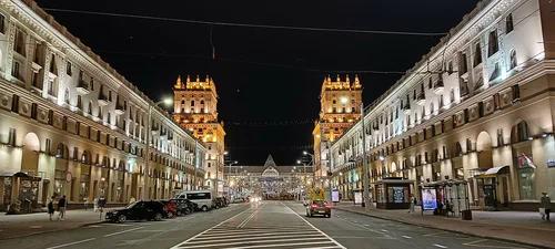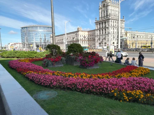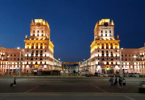 Первое, что видишь при выходе из ж/д вокзала Минск-Пассажирский, — две 11-этажные башни в стиле сталинского ампира, примыкающие к пятиэтажным домам. Башни называют «Воротами Минска», их построили в 1953 году. В них живут обычные люди: квартиры давали работникам железной дороги. На одной из башен установлены огромные часы немецкого производства — в Беларусь они попали как трофей после Великой Отечественной войны. Диаметр циферблата составляет 3,5 м, а длина минутной стрелки — 1 м 69 см.