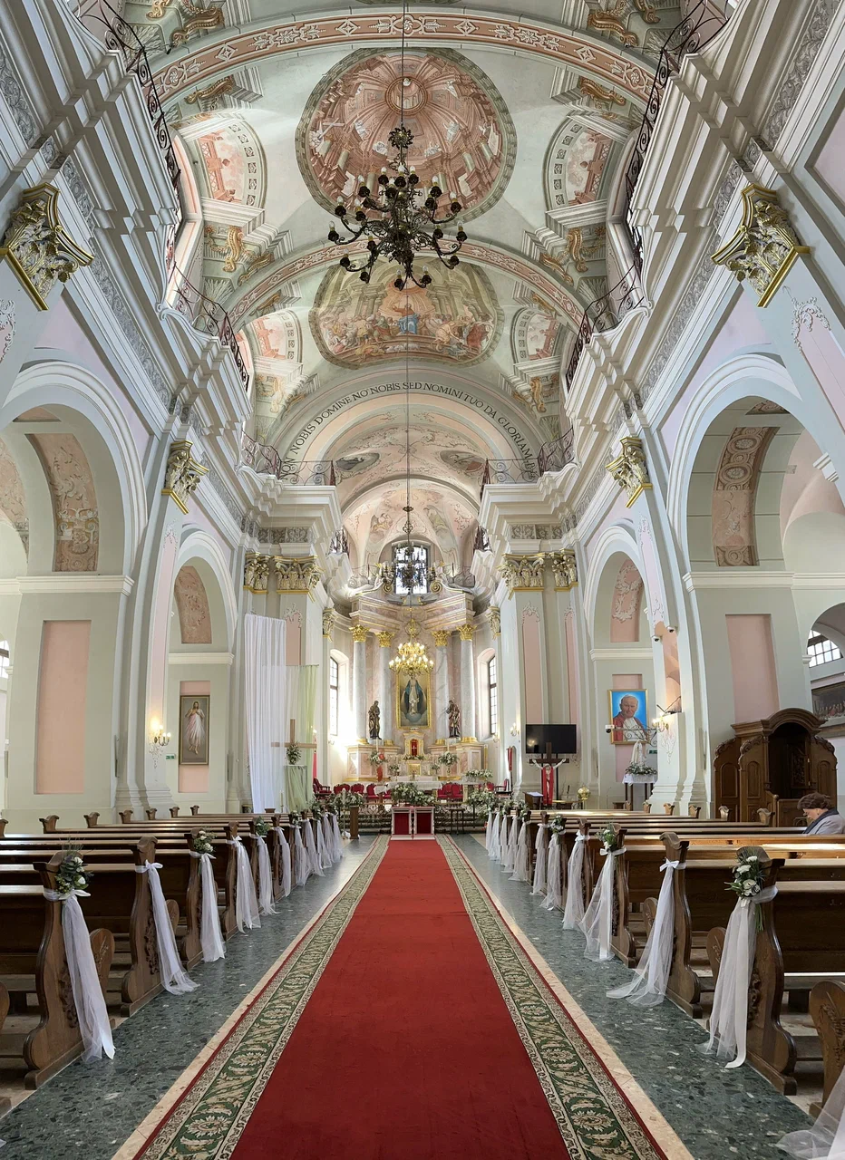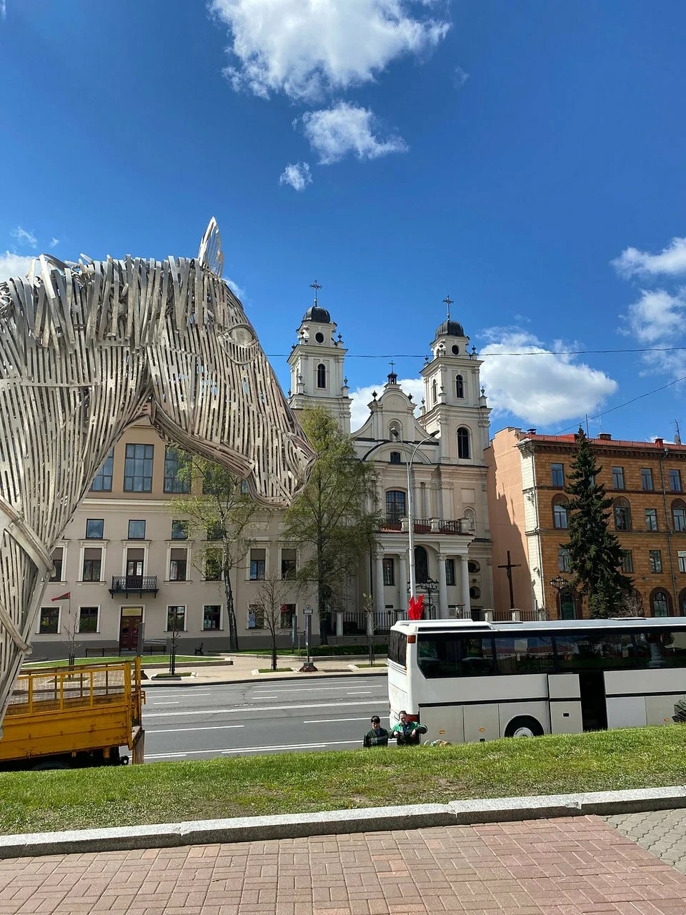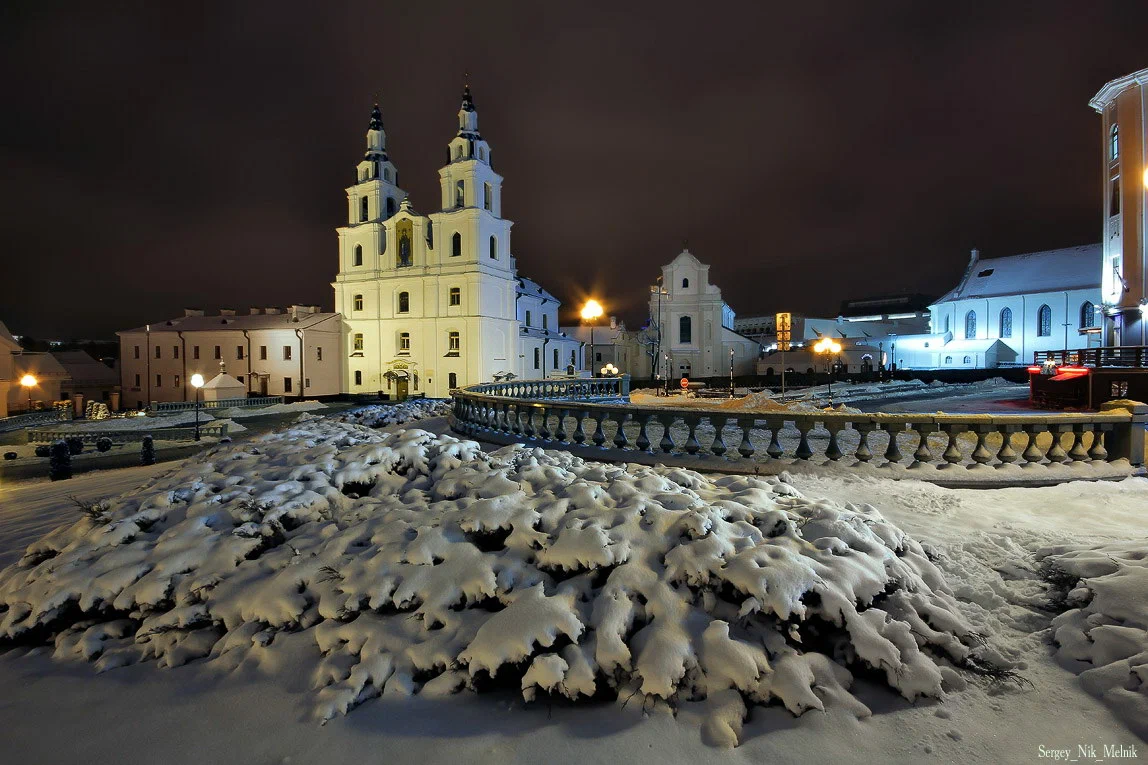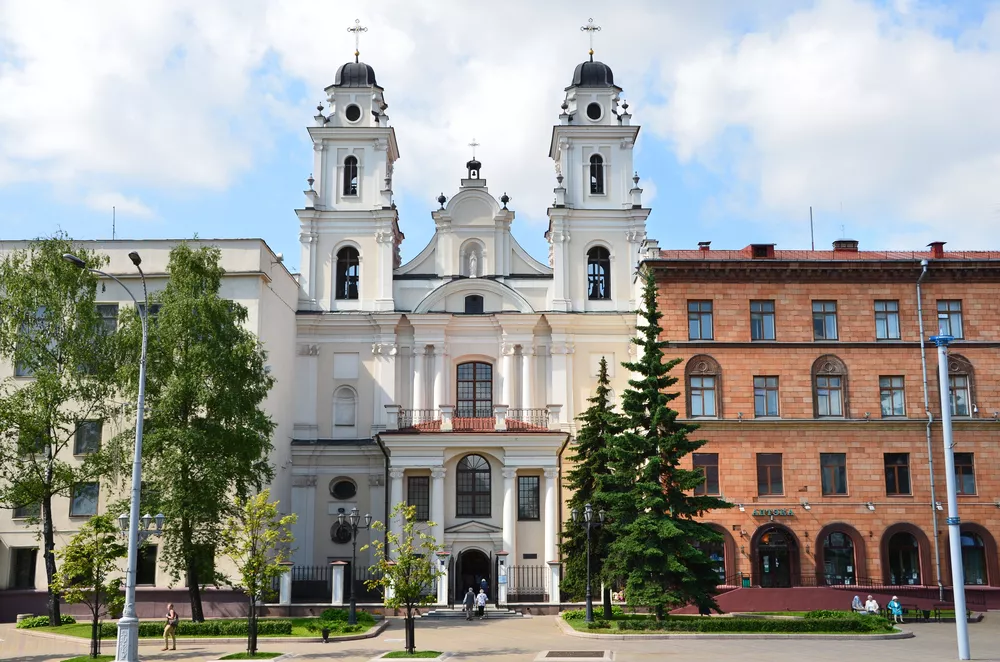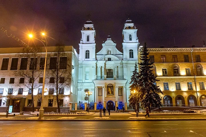 Напротив ратуши, на одной площади с православным Свято-Духовым собором, расположен и главный храм местных католиков — кафедральный собор Пресвятой Девы Марии. Он возведен в 1700-1710 годах в стиле белорусского барокко и изначально был церковью иезуитов. В 1798 году в Беларуси была создана католическая епархия, тогда церковь освятили в честь Святой Девы Марии и присвоили ей статус католического кафедрального собора.