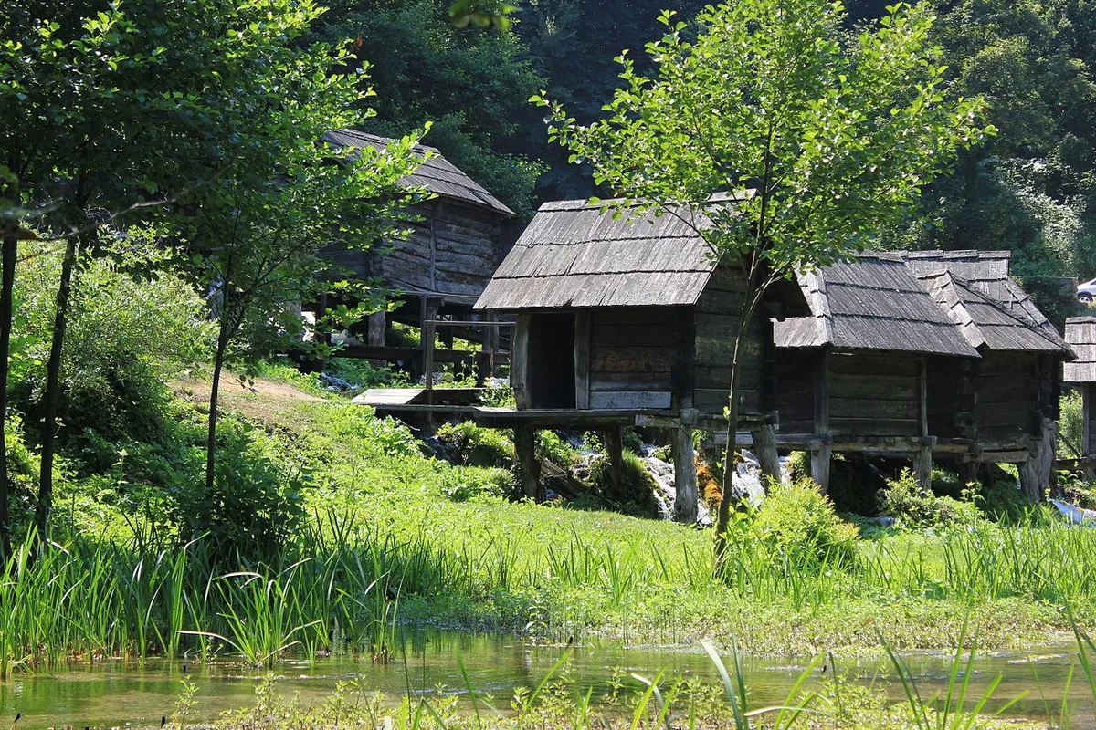 Jajce, in the central region of Bosnia and Herzegovina, is a historic city all about falling water. The little windowless huts sit on top of skinny stilts right over the gushing water. Since the flow here is spread out, by using a series of little mills instead of one big water wheel, the diffuse water power could be aggregated.