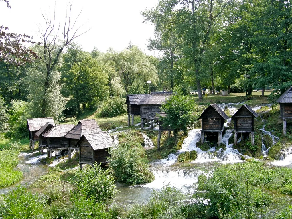 The Pliva Lakes in Jajce are a picturesque place with emerald waters and wooden watermills. The Great Pliva Waterfall, cascading into the Small Pliva Lake, creates a breathtaking natural spectacle.