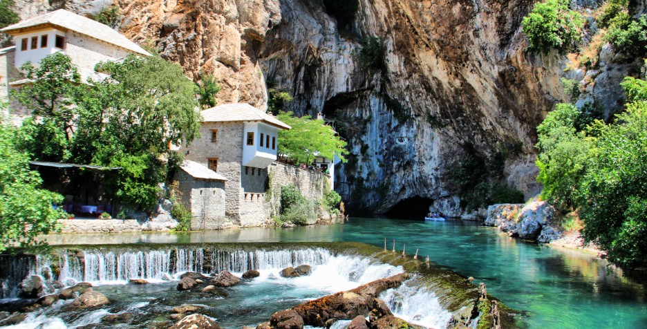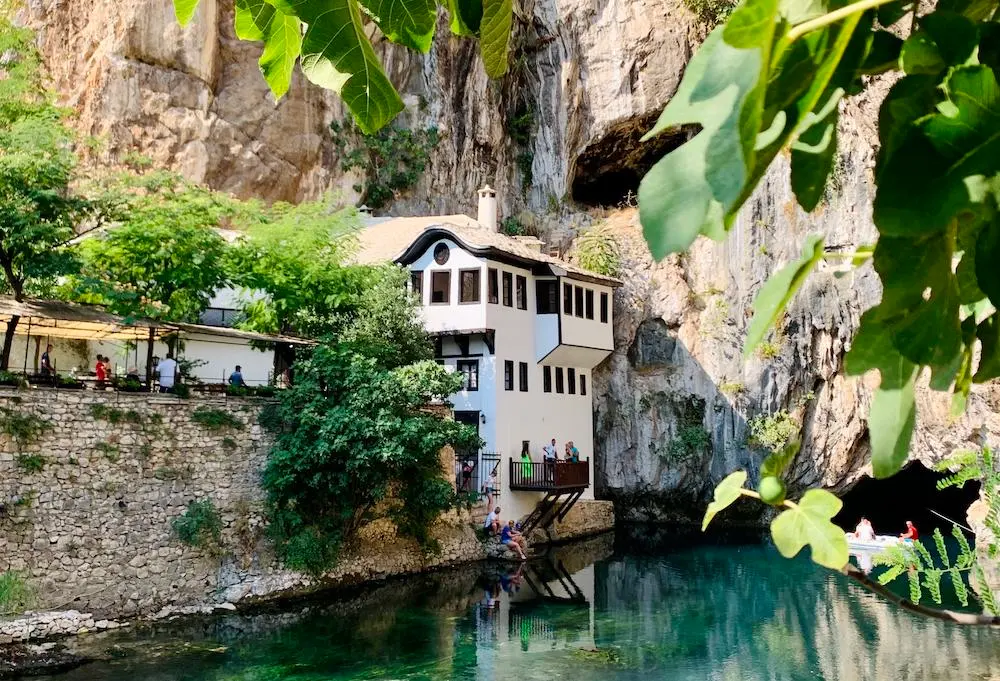 Only a short distance from Mostar, the monastery in Blagaj stuns visitors with its exquisite natural setting. The modest, Ottoman-era building sits at the base of an enormous cliff, where the Buna river seeps out from a mysterious cave and over a small crescent waterfall as it courses towards the larger Neretva. The water flowing by the monastery is a stunning hue of blue and is said to contain mystic properties.