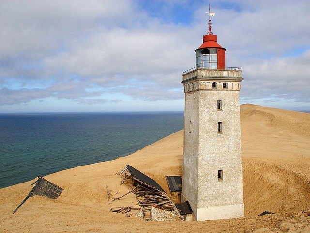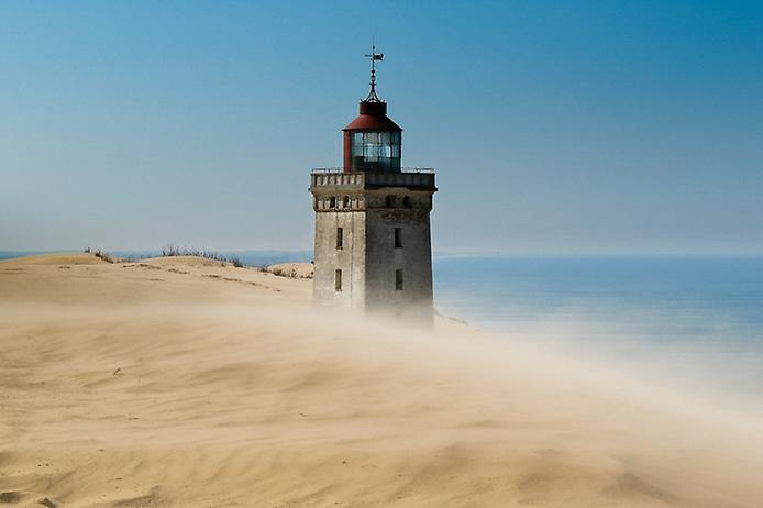This lighthouse on top of a 60-metre cliff on the North Sea coast was built in the late 19th century. Over time, strong winds and soil erosion created a huge sand dune around it. The sand swallowed up the trees and houses around the lighthouse, and eventually the entrance to the lighthouse itself. The last signal from Rubjerg Knud was given in 1968.