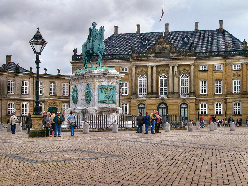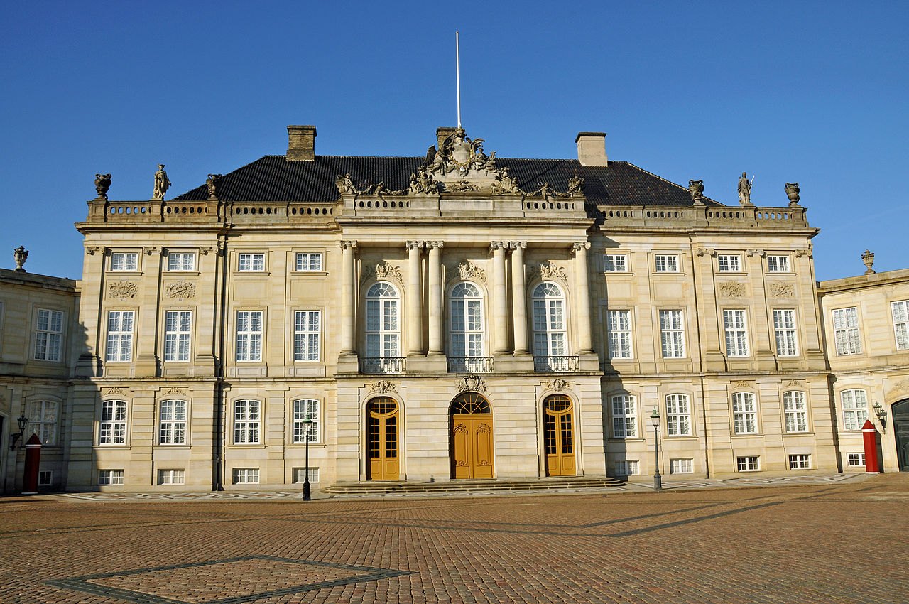 The architectural ensemble of Amalienborg consists of four mansions located around a square with a monument to the founder of the palace, Frederick V. The Christian VII mansion is used to receive royal guests and hold presentations, while the Christian VIII mansion houses the royal library and the museum of the Danish branch of the Glücksburg dynasty. The Frederick VIII mansion is used as a royal residence, as is the Christian IX mansion, where the now former Queen Margrethe II lives.