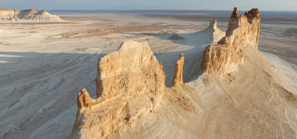 Плато Устюрт — огромная каменистая равнина, простирающаяся на территории Казахстана, Узбекистана и Туркменистана. А урочище Бозжыра, находящееся на плато, известно уникальными скальными образованиями и захватывающими ландшафтами, как из фильмов Кэмерона и Нолана. На плато Устюрт находятся несколько соленых озер, которые придают местности особую атмосферу.