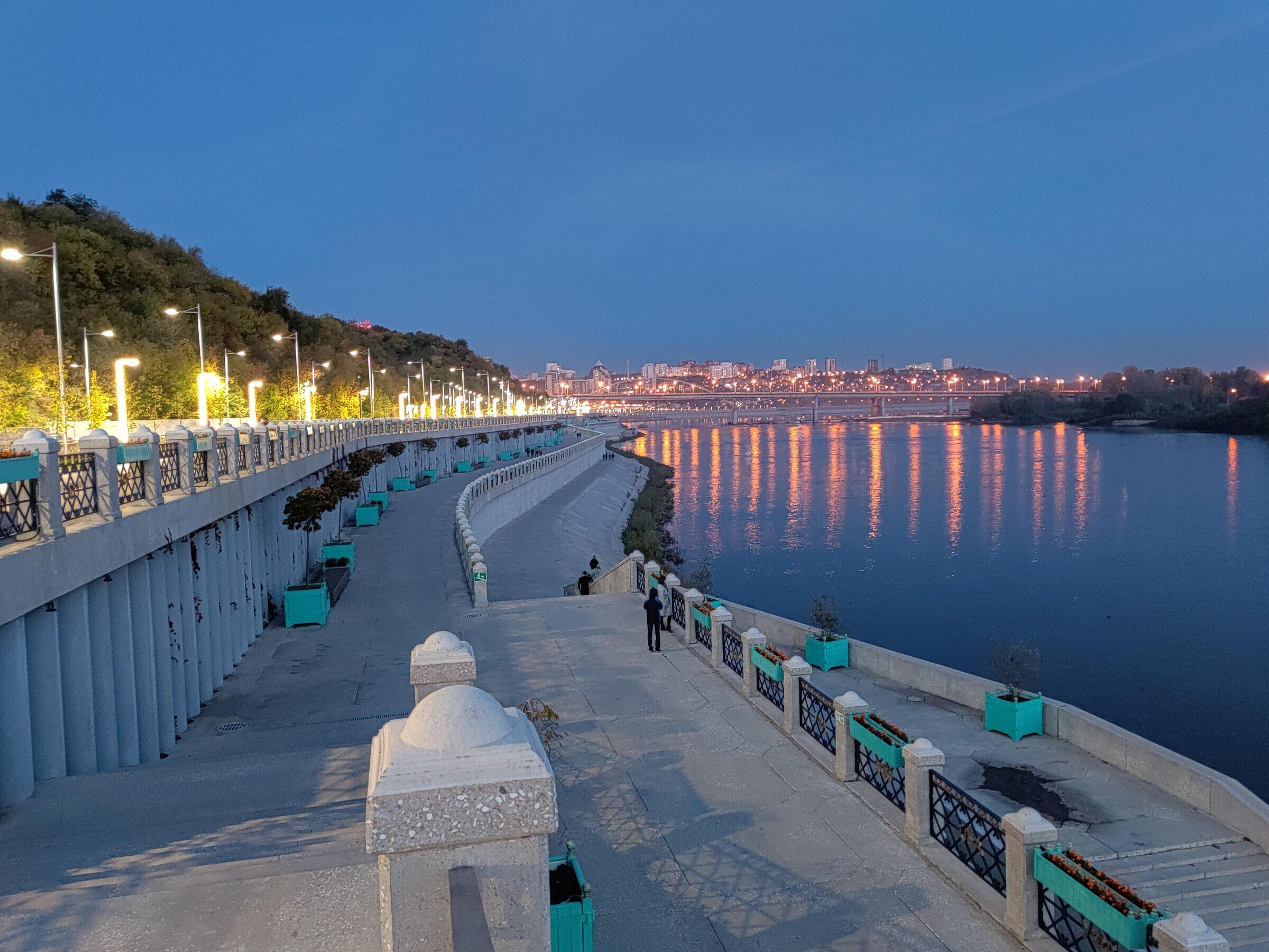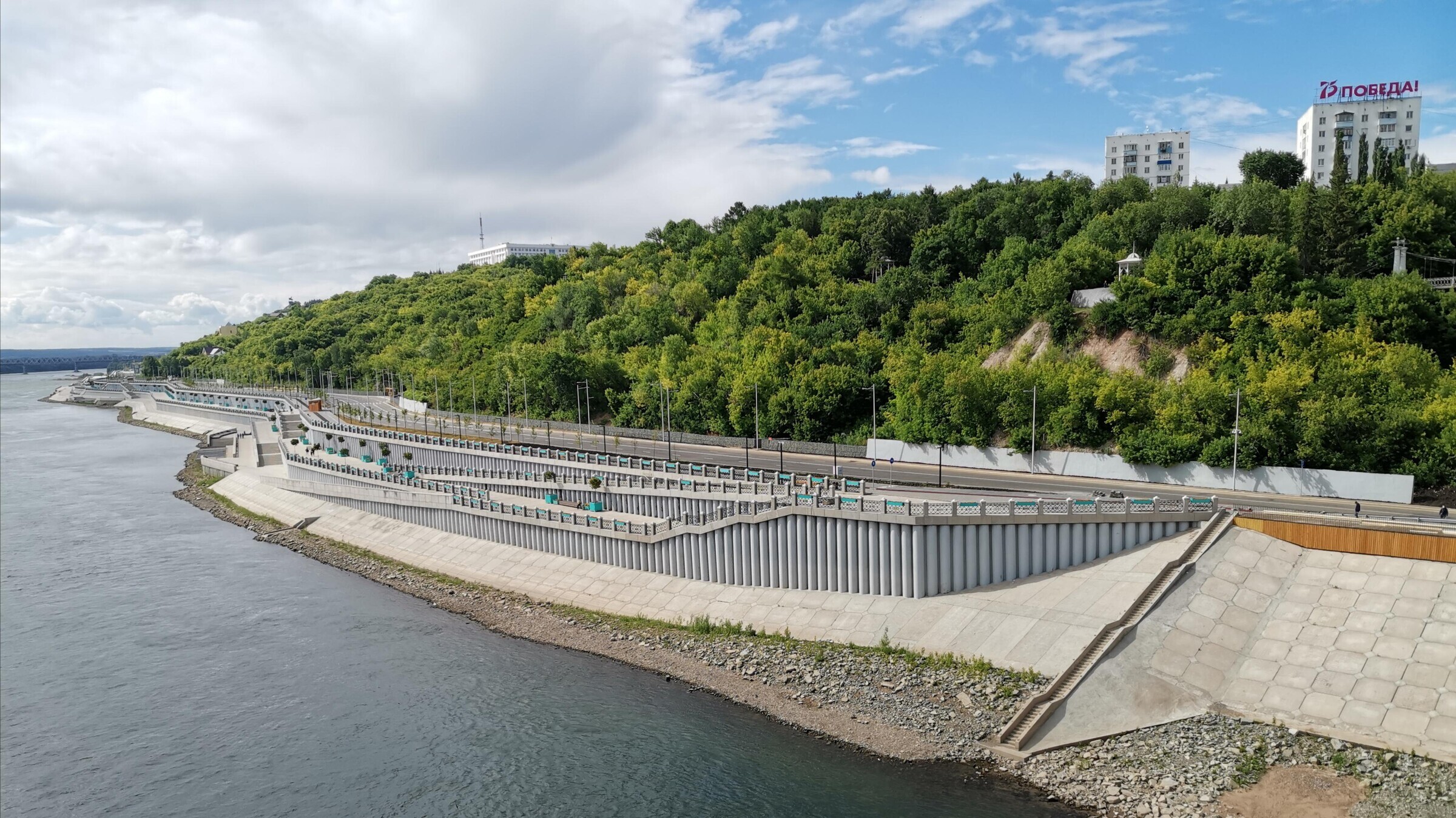 Эффектный променад на правом берегу Белой тянется на 7 км и состоит из четырех уровней, которые сообщаются между собой дорожками и лестницами. Аккуратные террасы вымощены плиткой, имеют ажурные металлические ограды. На набережной работают кафе и рестораны. Много удобных скамеек, широких деревянных лавочек-шезлонгов, где приятно отдыхать, наблюдать за рекой и противоположным берегом Белой.