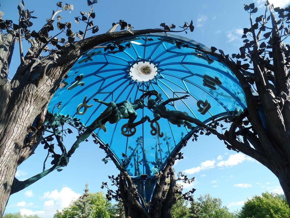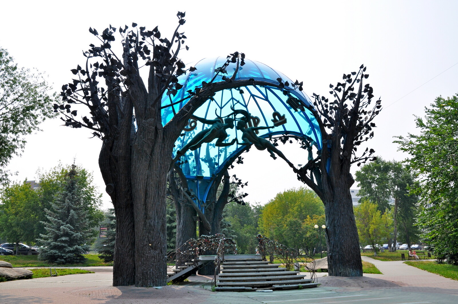 Сфера любви — это, пожалуй, самая романтичная достопримечательность Челябинска. Находится этот арт-объект в одном из центральных скверов и представляет собой стеклянный купол, опирающийся на металлические деревья, символизирующие начало новой жизни — новой семьи. Под куполом стремятся слиться в поцелуе мужская и женская фигуры, а внизу на земле находится небольшой помост, перила которого изрядно потяжелели от навесных замков.
