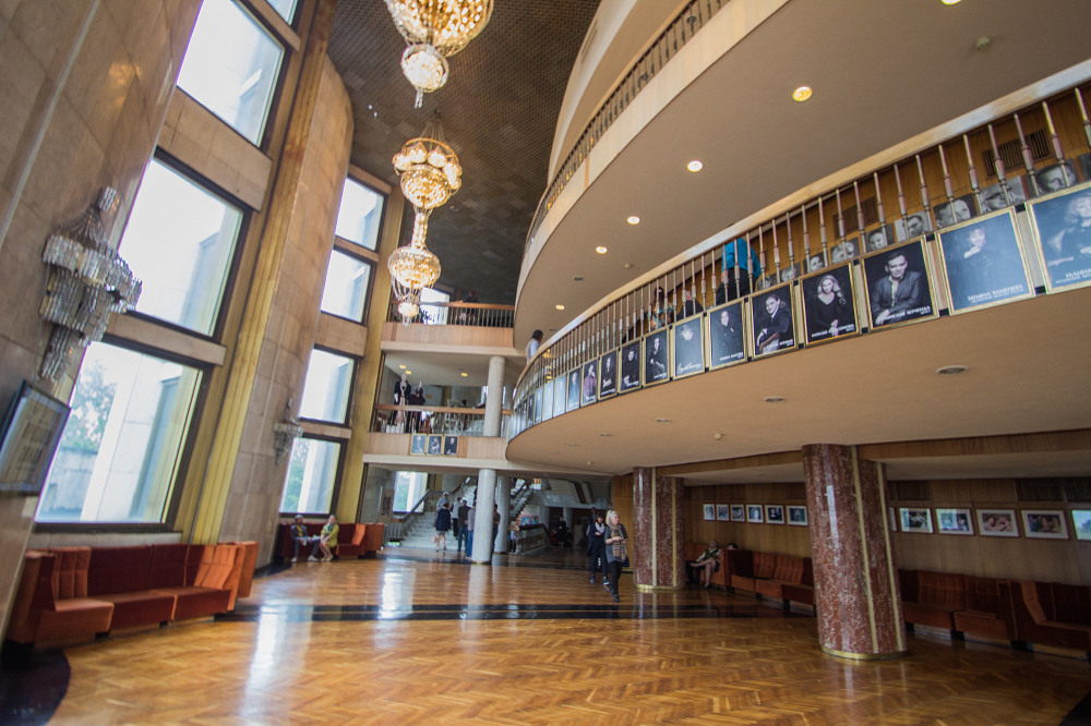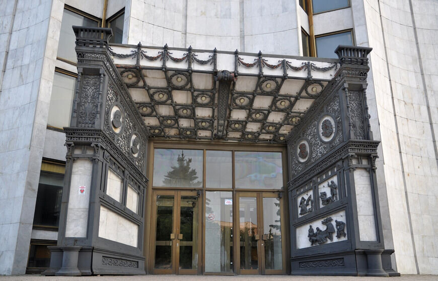 Издали здание напоминает административное, однако фасад показывает, что это не так. Вверху изображены 2 огромные маски, а вход украшен множеством кованных элементов.