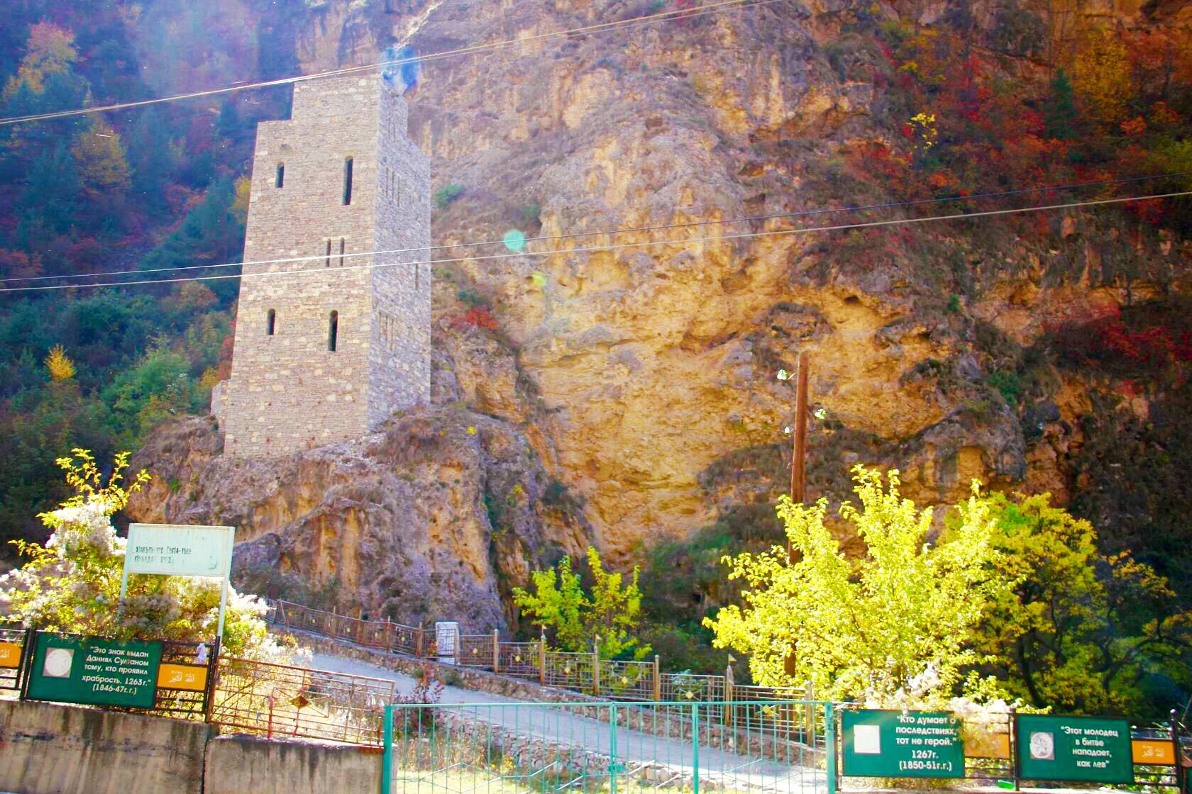 У подножия Гимринского хребта расположены древние оборонительные сооружения. Знатоки истории могут припомнить эпизоды Кавказской войны 19 века, в котором фигурировал этот комплекс. Он связан с жизнью борца за независимость горцев имама Шамиля. Время не пощадило башню, сегодня мы видим новую, построенную в 1997 году, и имеем возможность взобраться на вершину, полюбоваться ущельем.