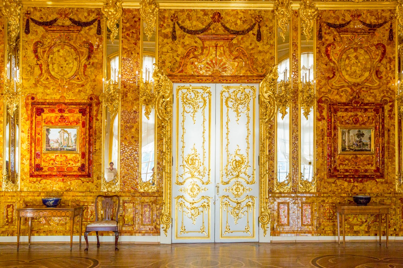 Это невероятное место – настоящая жемчужина Санкт-Петербурга. Шедевр искусства был создан в XVIII веке немецкими мастерами и преподнесен в подарок Петру I. Стены комнаты полностью покрыты янтарем, который создает потрясающий эффект света и тепла. Во время ВОВ Янтарная комната была вывезена из дворца немецкими войсками и спрятана в тайнике. После войны комната так и не была найдена, и ее судьба остается неизвестной до сих пор. Зал в Екатерининском дворце является ее точной копией.