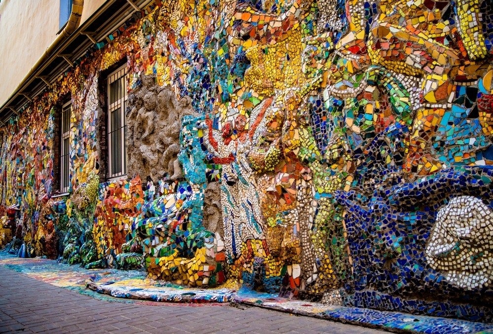 Настоящий арт-объект под открытым небом, одно из нетуристических мест Санкт-Петербурга, которое стоит посетить. Создан в 1984 году художником Владимиром Лубенко и его учениками из Малой Академии искусств. Весь двор украшен яркими мозаичными панно, фигурами людей, ангелов, львов, птиц в стиле модерн. Мозаичные композиции отражают философские воззрения автора на гармонию и духовность. Дворик стал музеем современного искусства, обязательным пунктом туристических маршрутов по неформальному Петербургу.