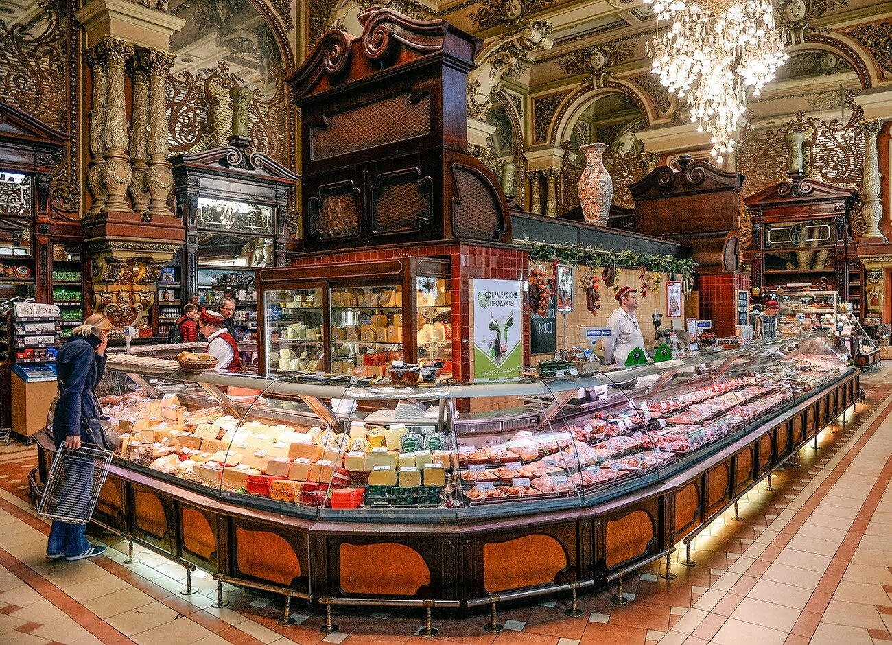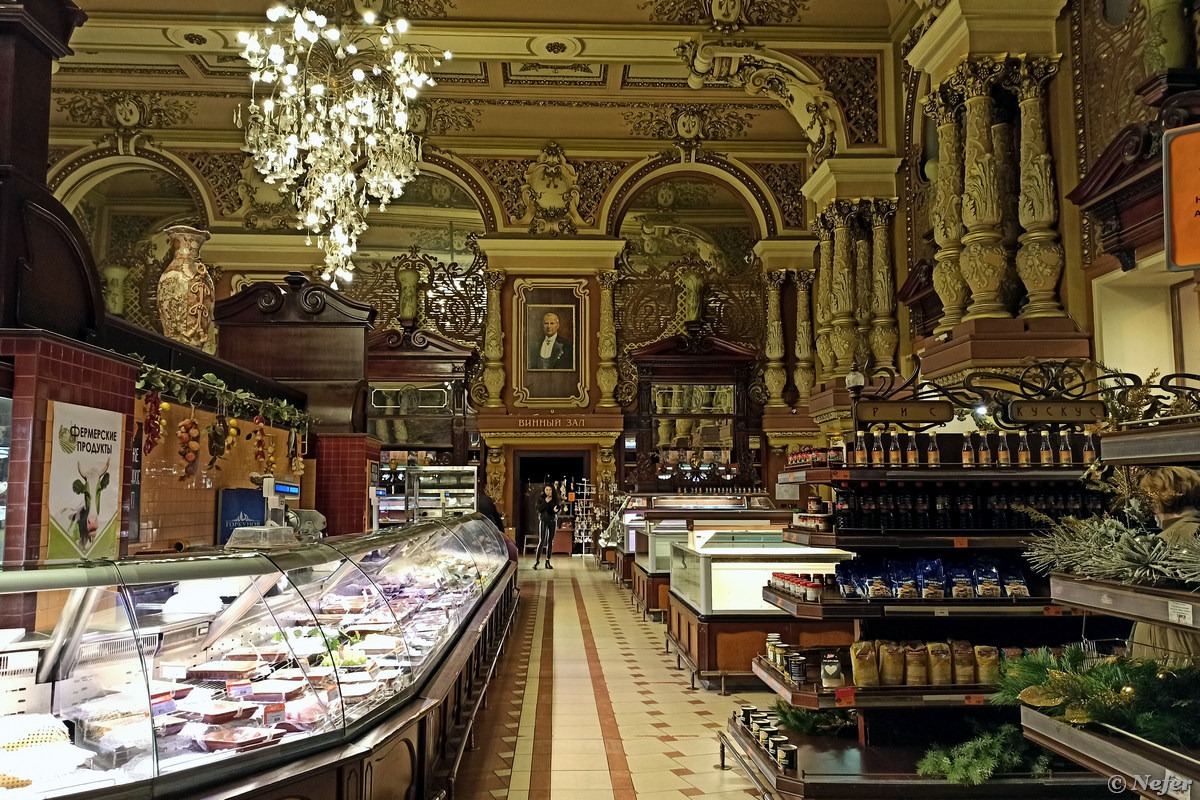 Магазин был открыт в 1901 году Григорием Елисеевым и с тех пор является символом роскоши и изысканности. Внутри магазина можно увидеть интерьеры с лепниной, позолотой и зеркалами. Здесь можно приобрести как продукты из доступного ассортимента на каждый день или товары из дорогого сегмента. В магазине работает кофешоп, где можно угоститься кондитерскими изделиями и горячими напитками.