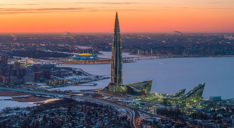Небоскреб высотой 462 метра, расположенный на берегу Финского залива, был построен в 2018 году и считается самым высоким в Европе. Зимой башня превращается в огромную елку за счет зеленой подсветки, а по праздникам окрашивается в цвета триколора. Внутри здания находится штаб-квартира Газпрома, предусмотрены места для офисов, научно-образовательного центра, зрительного зала. Обустроены развлекательные комплексы и бизнес-пространства, ресторан с панорамным видом.