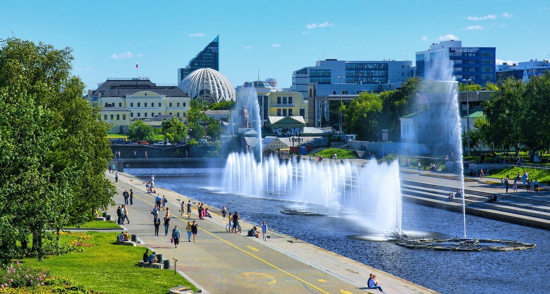 Плотина Городского пруда на реке Исеть в Екатеринбурге, а также прилегающая территория Исторического сквера.