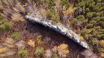Высота горы 347 метров над уровнем моря. Со всех сторон имеет пологие склоны и полностью покрыта лесом. Скалы находятся на вершине покрытого лесом увала и представляют собой складчатый каменный гребень высотой до 34 метров из отдельных массивных башен, возвышающихся на сложенном из гранитных плит постаменте. Гряда в длину достигает 70 метров и вытянута с юго-востока на северо-запад. Северная стена обрывается крутым уступом и представлена отвесными и слабонависающими скалами.