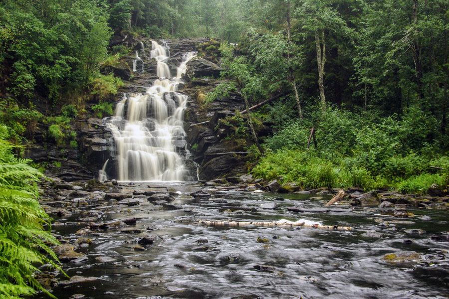 К водопаду ведет деревянная лестница с перилами, можно спуститься прямо к подножию и насладиться мощью и величием 18-метровых потоков воды в окружении стройных елей. Весной и осенью он особенно полноводен. Неподалеку расположен еще один водопад – Белые мосты-2. Он пониже и спокойней. Местные жители называют их ласково «братья-падуны».