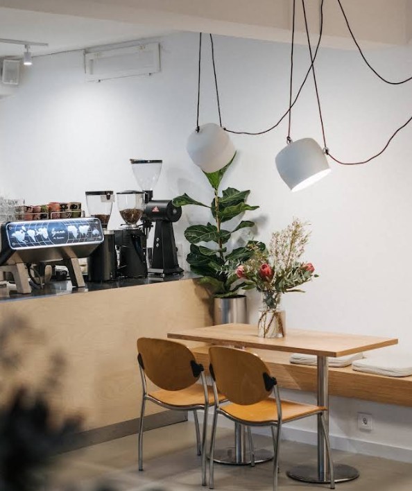 The coffee shop has a modern interior with retro elements, lots of light and a small but cozy terrace. The assortment includes both coffee classics and a variety of alternatives, as well as fresh croissants, vegan and gluten-free pastries and tiramisu.