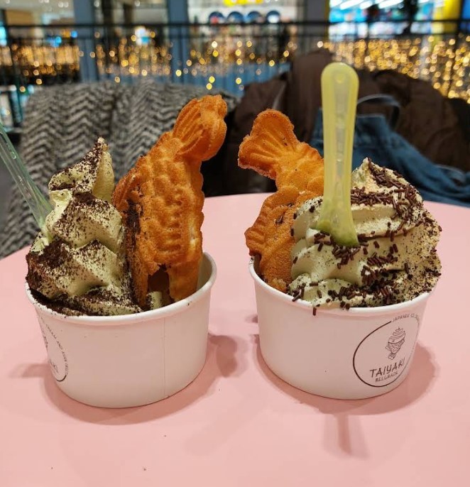 You can choose to have your ice cream in a waffle fish, a paper cup, or a tall glass. On this particular day, there were three flavors available: vanilla, blueberry, and pistachio. After choosing your flavor and container, you can opt for toppings or decorations for your ice cream creation