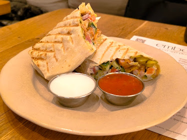 Small pancakes, 10 pieces in each portion. There are many different sauces to choose from (white, milk chocolate, jams, etc.). Pancakes can also be sprinkled with salted caramel, nuts, cookies, fresh fruit. The choice is huge, everyone can find a combination to their taste.