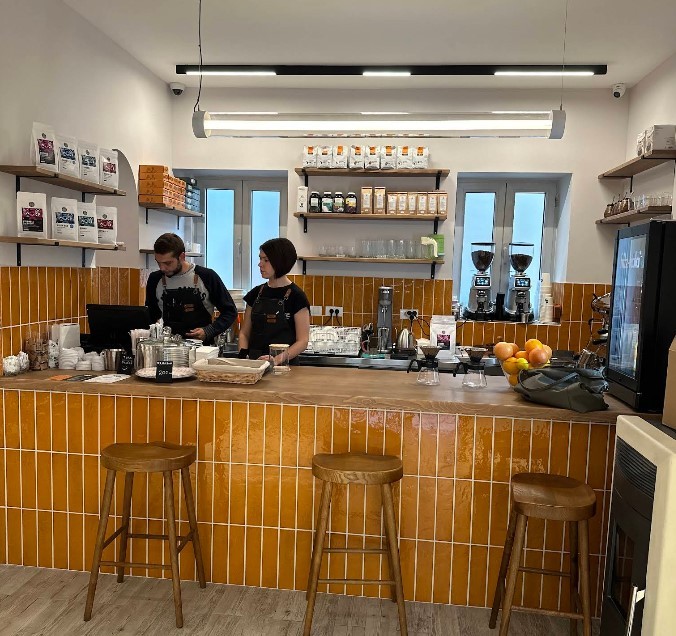 The coffee shop has a modern interior with retro elements, lots of light and a small but cozy terrace. The assortment includes both coffee classics and a variety of alternatives, as well as fresh croissants, vegan and gluten-free pastries and tiramisu.