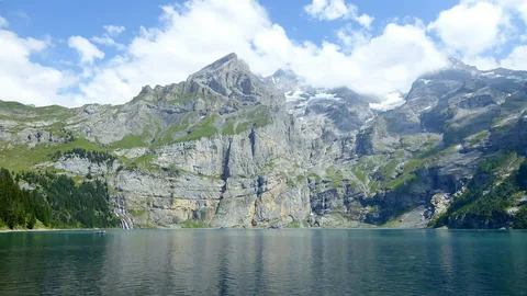 Oeschinen Lake is one of the most beautiful places to visit in Switzerland. Its blue-green waters are surrounded by 3,500-metre-high jagged peaks that rise steeply from its shores. During the summer, the whole area looks like a huge pot of ice and rock. When the sun is shining the water is a brilliant turquoise colour.