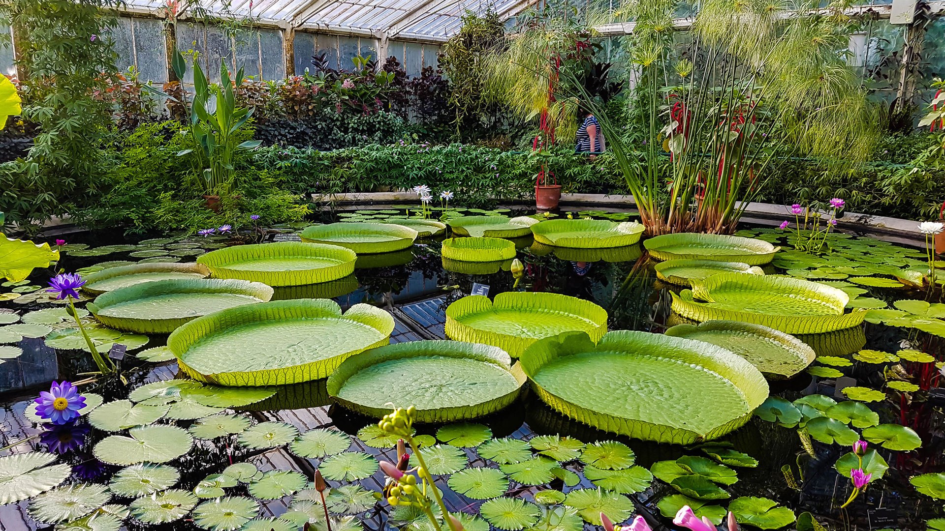 A large botanical garden with trees and flowers from all over the world, large greenhouses and a treetop walkway.